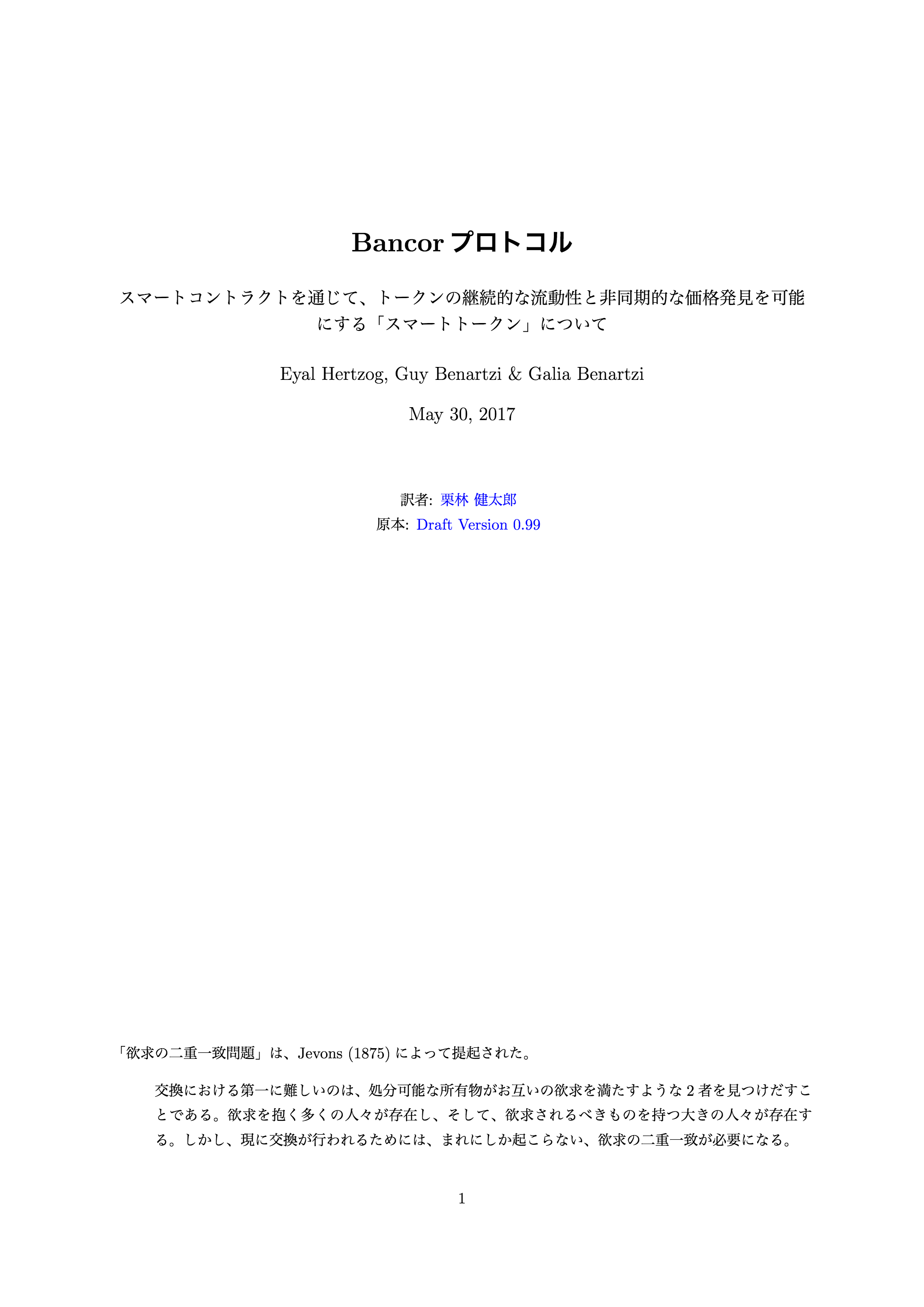 暗号通貨を追っていく過程で、Bancorプロトコルという、「スマートトークンと呼ばれる新世代の暗号通貨のための標準」と謳われる方式を知り興味を覚えたので、自分の理解のためにもホワイトペーパーを翻訳してみました。